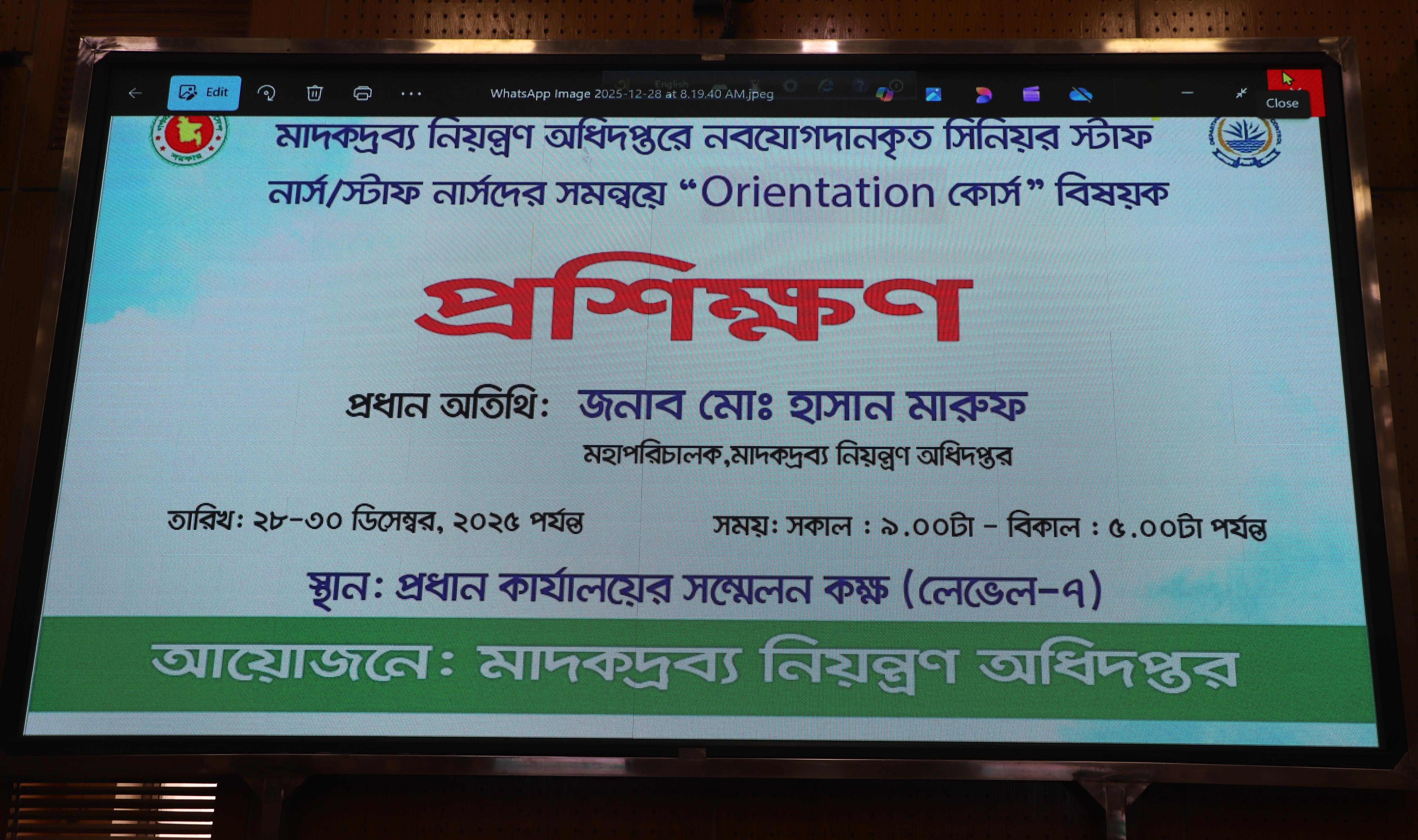 ২৮-৩০ ডিসেম্বর ২০২৫ তারিখ পর্যন্ত ৩ দিনব্যাপী অনুষ্ঠেয় মাদকদ্রব্য নিয়ন্ত্রণ অধিদপ্তরের নবযোগদানকৃত ৪১ জন সিনিয়র স্টাফ নার্স/স্টাফ নার্সদের সমন্বয়ে "Orientation কোর্স” শীর্ষক প্রশিক্ষণ অনুষ্ঠান