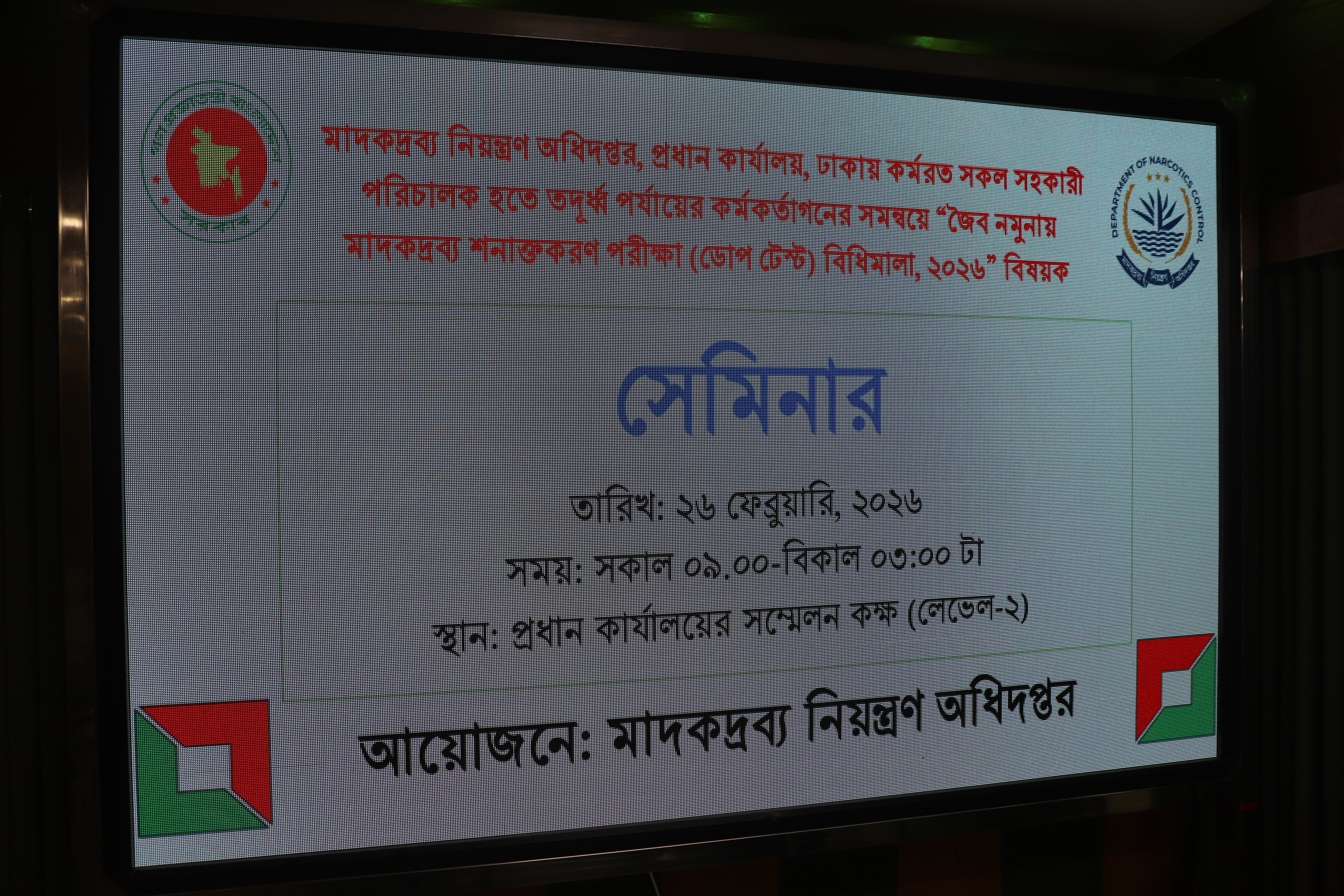 সেমিনার: ২৬-০২-২০২৬ তারিখ সকাল ০৯:০০ ঘটিকায় অনুষ্ঠিতব্য ”জৈব নমুনায় মাদকদ্রব্য সনাক্তকরণ পরীক্ষা (ডোপ টেস্ট) বিধিমালা, ২০২৬” বিষয়ে অনুষ্ঠিত সেমিনার
