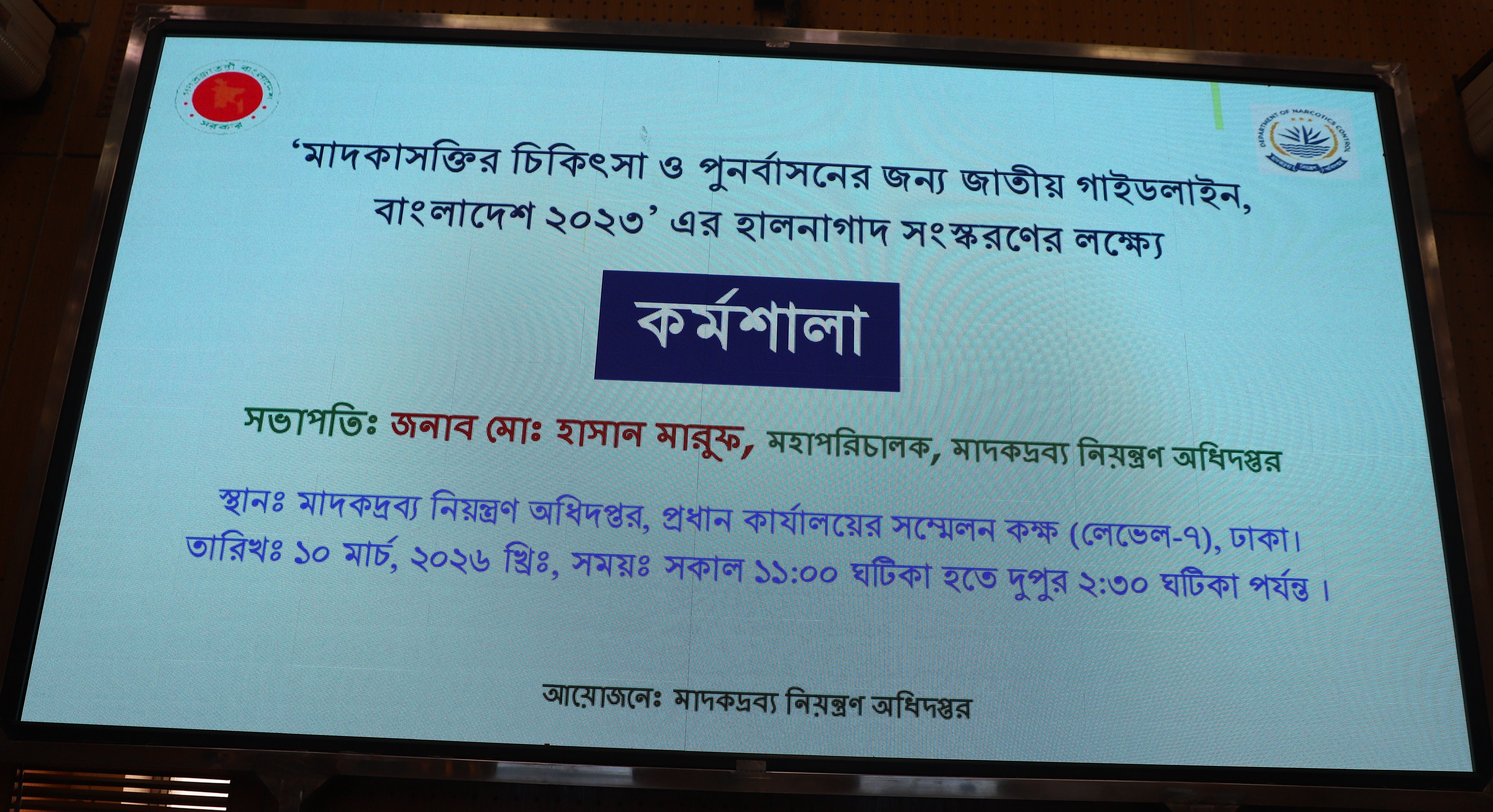 কর্মশালা: ১০-০৩-২০২৬ তারিখ সকাল ১১:০০ হতে ২:৩০ ঘটিকা পর্যন্ত অনুষ্ঠেয় “মাদকাসক্তির চিকিৎসা ও পুনর্বাসনের জন্য জাতীয় গাইডলাইন, বাংলাদেশ ২০২৩” এর হালনাগাদ সংস্করণের লক্ষ্যে অনুষ্ঠিত কর্মশালা